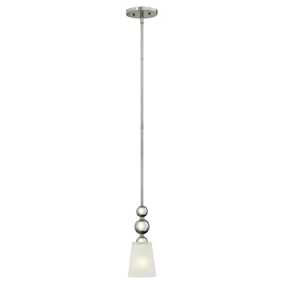 Oprawa łączy lustrzaną kolumnę z polerowanego niklu zakończoną dwiema ozdobnymi kulami z niewielkim stożkowym kloszem z mlecznego szkła, który łagodzi światło i kieruje główny strumień w dół. Smukła, pionowa forma i pojedynczy punkt świetlny sprawiają, że sprawdzi się nad blatem kuchennym, stolikiem nocnym lub w grupie kilku sztuk nad wyspą.