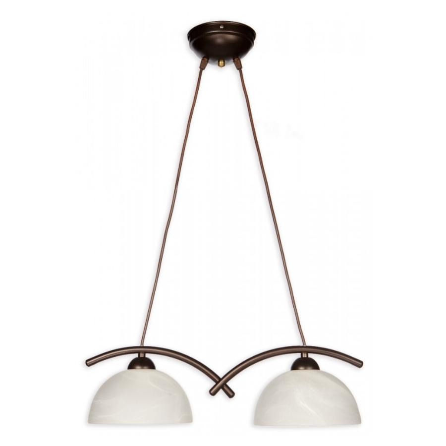 Dwupunktowa oprawa łączy metalową konstrukcję w ciepłym odcieniu wenge z dwoma kloszami ze szkła w kolorze białego alabastru, które rozpraszają światło i łagodzą blask żarówek. Delikatnie wygięte ramiona kierują klosze w dół, co dobrze sprawdza się nad blatem kuchennym lub prostokątnym stołem jadalnianym.