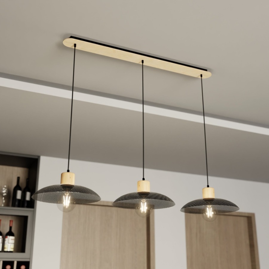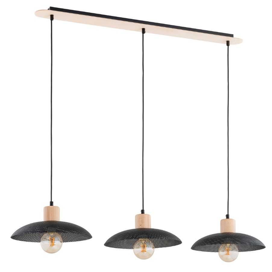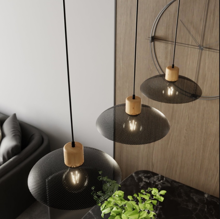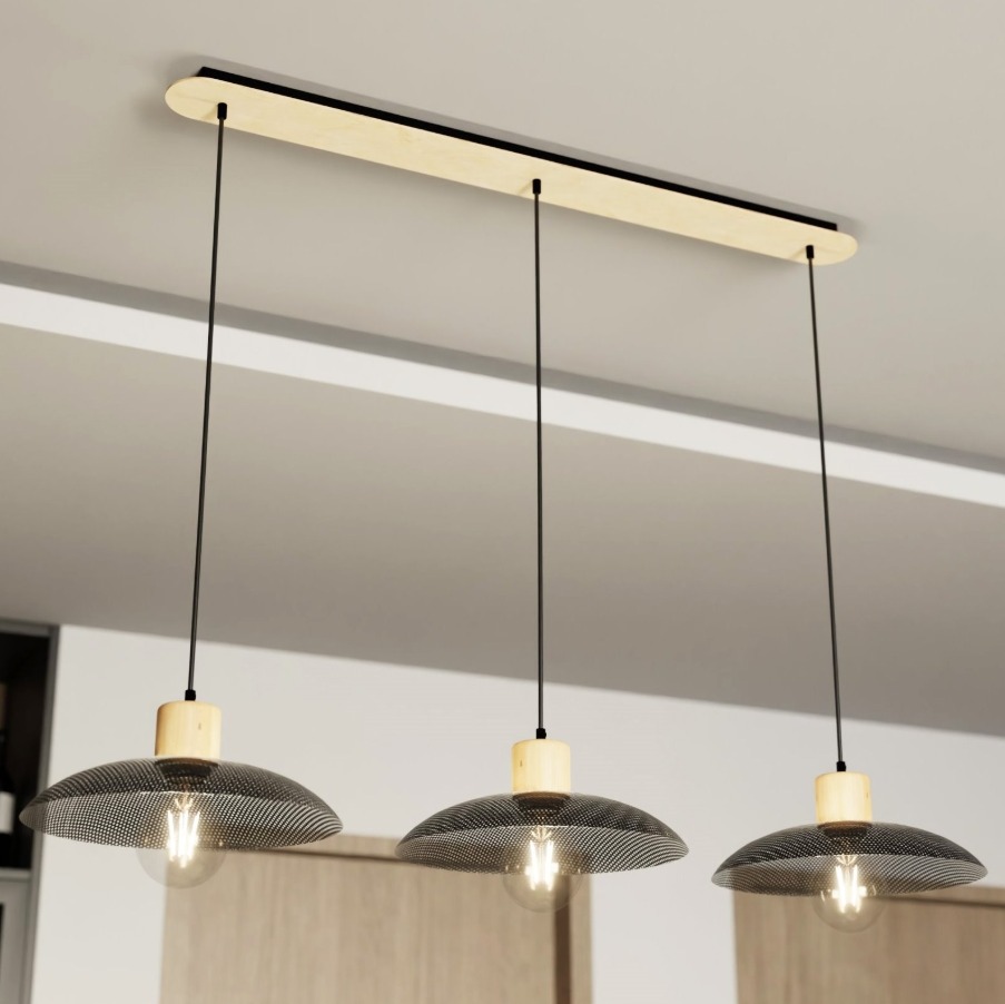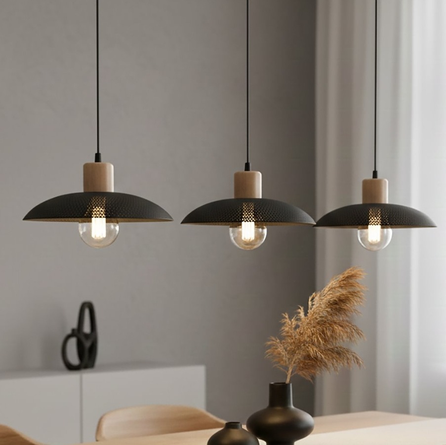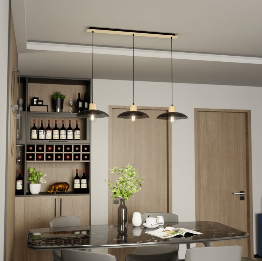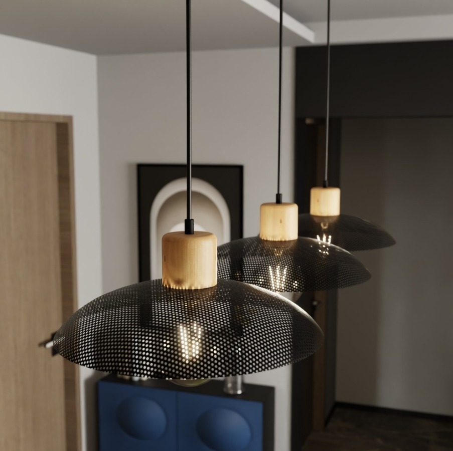 Trzy szerokie, talerzowe klosze z perforowanego metalu w matowej czerni zawieszone na smukłych przewodach, z ciepłym akcentem jasnego drewna tuż przy oprawce. Drobne otwory w blasze przepuszczają światło ku górze, tworząc na suficie delikatną siatkę refleksów, podczas gdy główny strumień kierowany jest w dół, wprost na blat. Żarówki E27 pozostają widoczne spod płaskiego klosza, dlatego warto dobrać dekoracyjne źródło typu Edison, które stanie się częścią aranżacji. Listwa podsufitki o długości 60 cm pozwala równomiernie rozłożyć trzy punkty świetlne nad stołem jadalnym do około 140–160 cm szerokości lub nad wyspą kuchenną.