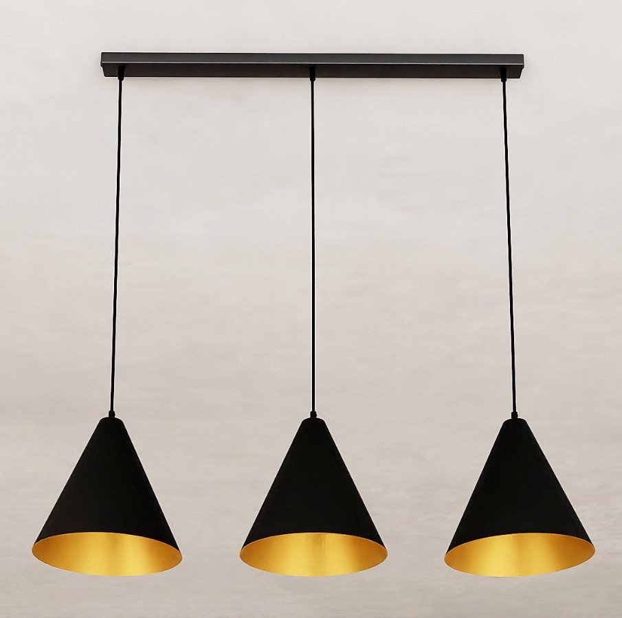 Trzy stożkowe klosze z metalu w matowej czerni skrywają wnętrza w ciepłym, złotym odcieniu, które odbija światło w dół i nadaje mu miodową, nastrojową barwę. Każdy klosz o średnicy 24 cm kieruje snop ku blatowi, nie rozpraszając go na boki, co sprawia, że lampa dobrze doświetla stoły o długości 120–180 cm lub wyspy kuchenne o zbliżonych proporcjach. Otwarta dolna krawędź klosza odsłania żarówkę, dlatego warto dobrać dekoracyjną bańkę E27 o mlecznym szkle, by uniknąć bezpośredniego olśnienia siedzących przy stole. Podłużna listwa sufitowa o długości 75 cm utrzymuje trzy przewody w równych odstępach i dobrze komponuje się z loftowymi oraz minimalistycznymi aranżacjami.
