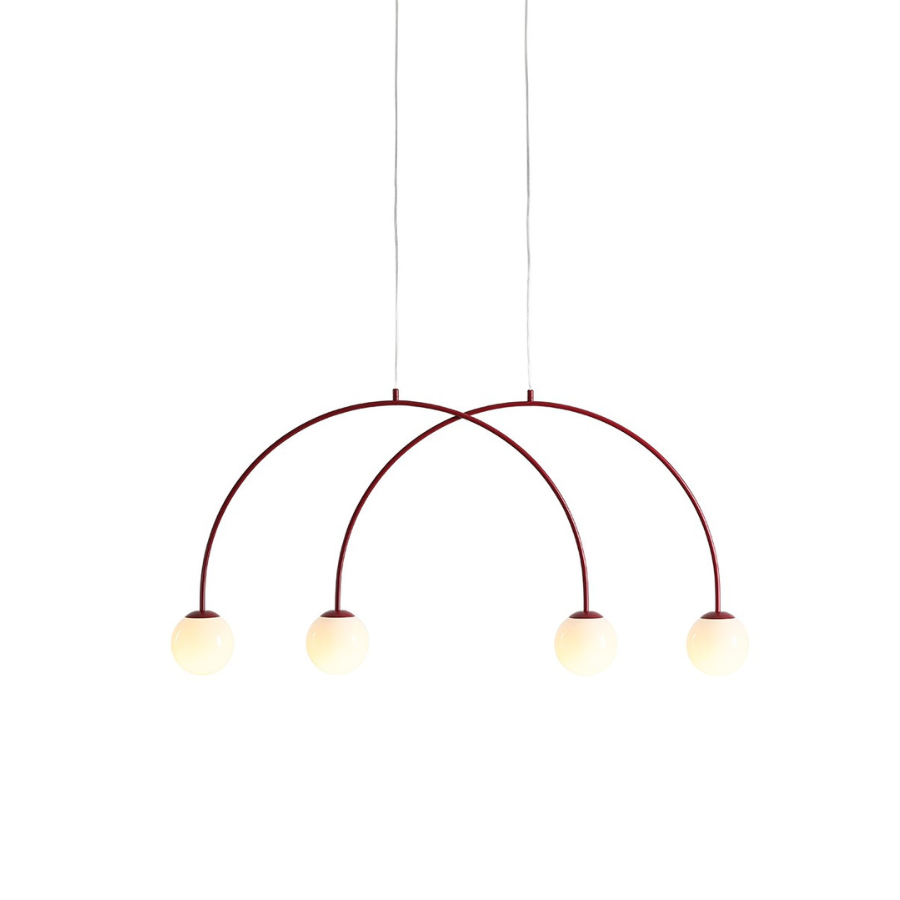 Lampa Una to prawdziwy majstersztyk minimalistycznej elegancji. Jej bordowe metalowe łuki, które testowałem osobiście, zachwycają głębokim, matowym wykończeniem przypominającym kolor dojrzałego wina. Dwa łuki spotykają się w centralnym punkcie, tworząc harmonijną konstrukcję, która wydaje się tańczyć w powietrzu. Kremowe szklane klosze kontrastują z ciemnymi ramionami, emanując ciepłym, przytulnym światłem.