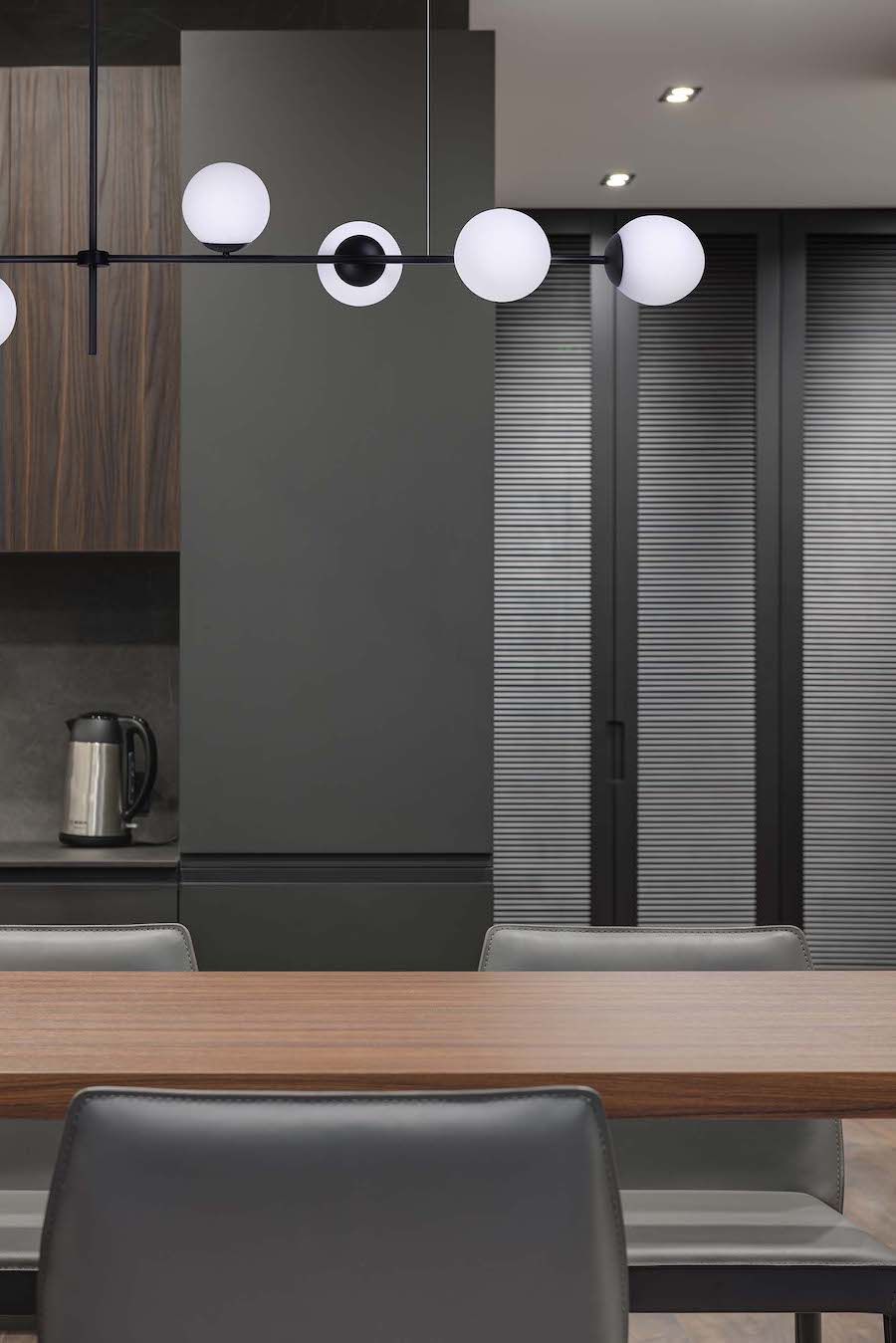 Duża lampa sufitowa Vuelta – Kaja – nad barek w industrialnej kuchni