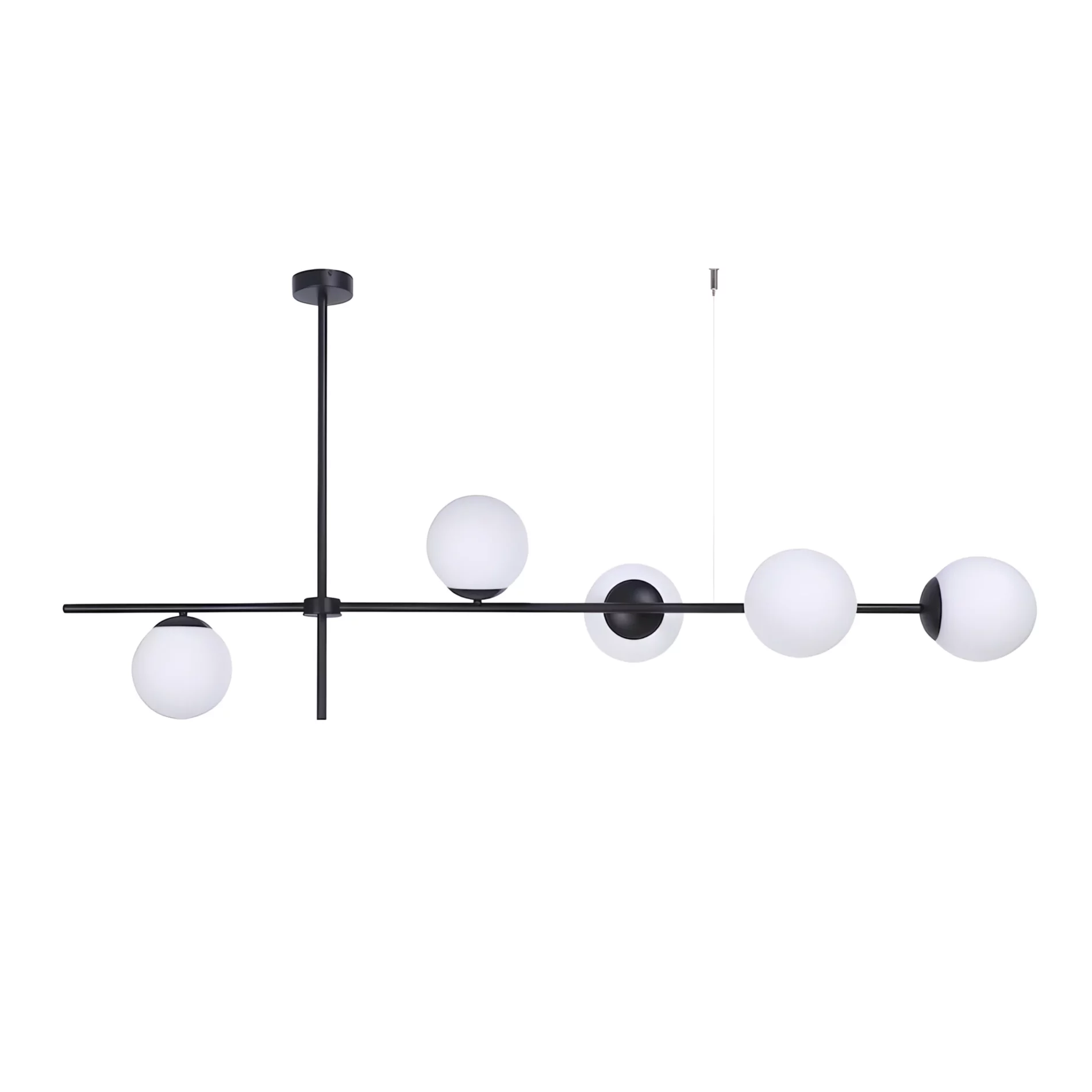 Duża lampa sufitowa z czarnym stelażem i białymi kloszami. W kolekcji Vuelta znajdziesz również inne rozmiary lamp w wersji na 3 i 4 źródła światła oraz model z ozdobnym kwietnikiem.