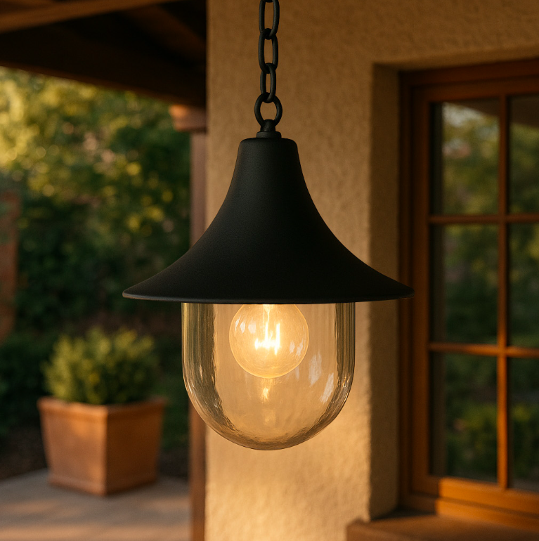 Boston sprawdzi się idealnie jako oświetlenie wejścia głównego, gdzie nie tylko pełni funkcję praktyczną, ale także wita gości eleganckim akcentem świetlnym. Na tarasie czy w altanie stworzy kameralną atmosferę podczas wieczornych spotkań, a zamontowana nad pergolą wprowadzi romantyczny nastrój do ogrodu. Regulowana długość łańcucha umożliwia precyzyjne dostosowanie wysokości zawieszenia do konkretnej przestrzeni – czy to niskiego zadaszenia tarasu, czy wysokiego sufitu werandy.
