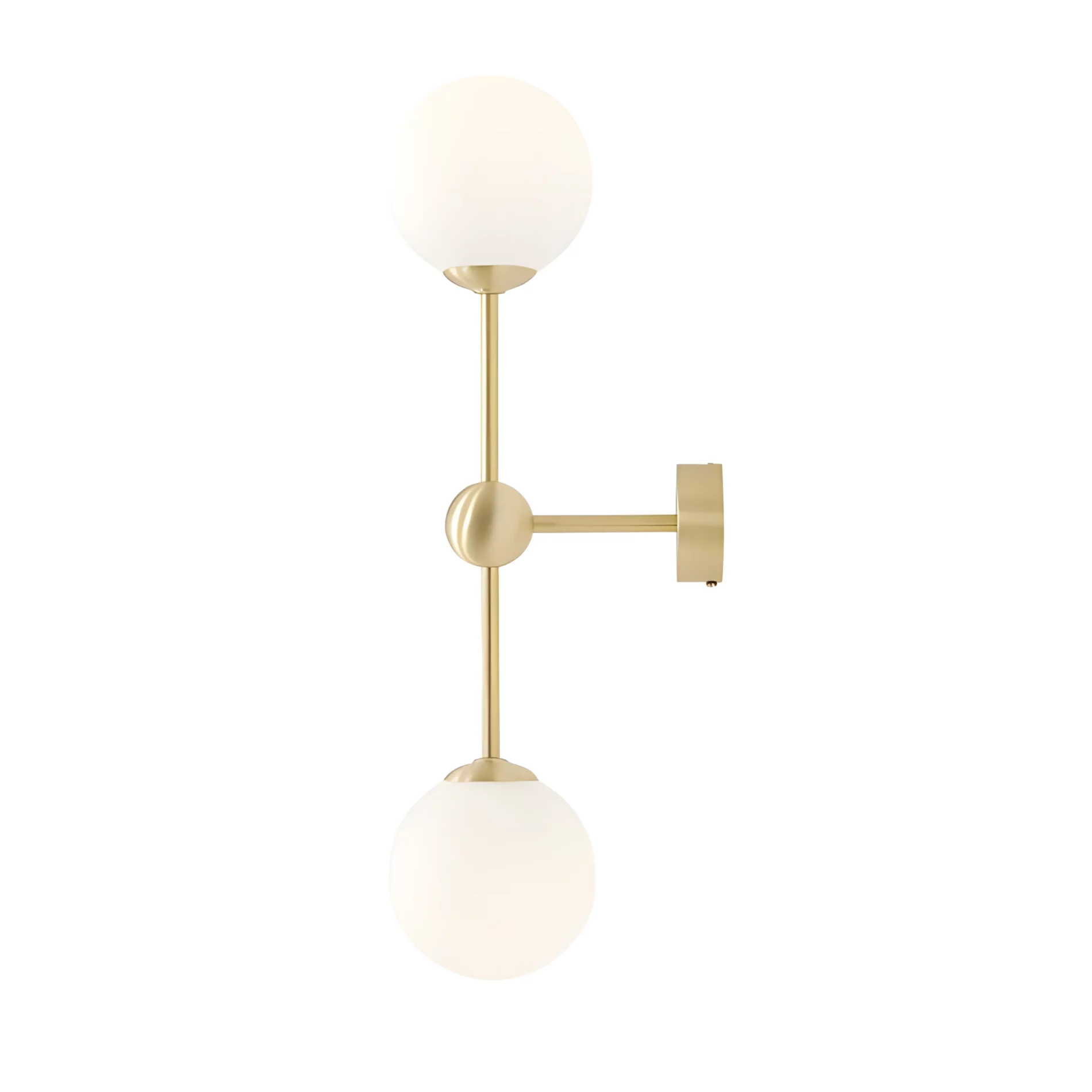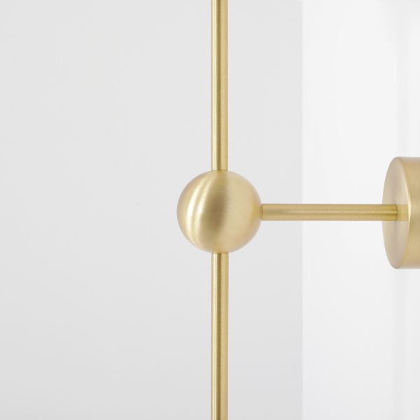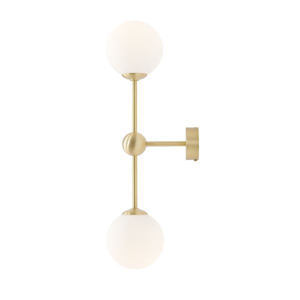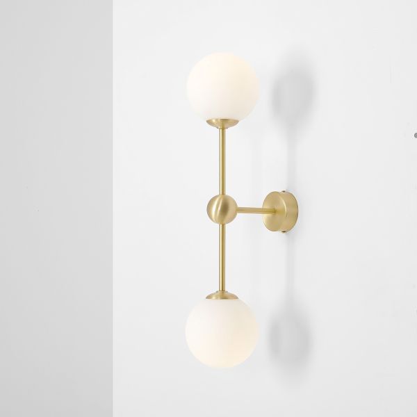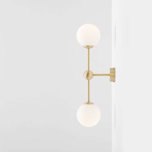 Lampa jest częścią limitowanej kolekcji oświetlenia ARTERA x ARDANT Piękny, złoty kinkiet z mlecznymi kloszami. Ozdobna kula na środku podstawy.
