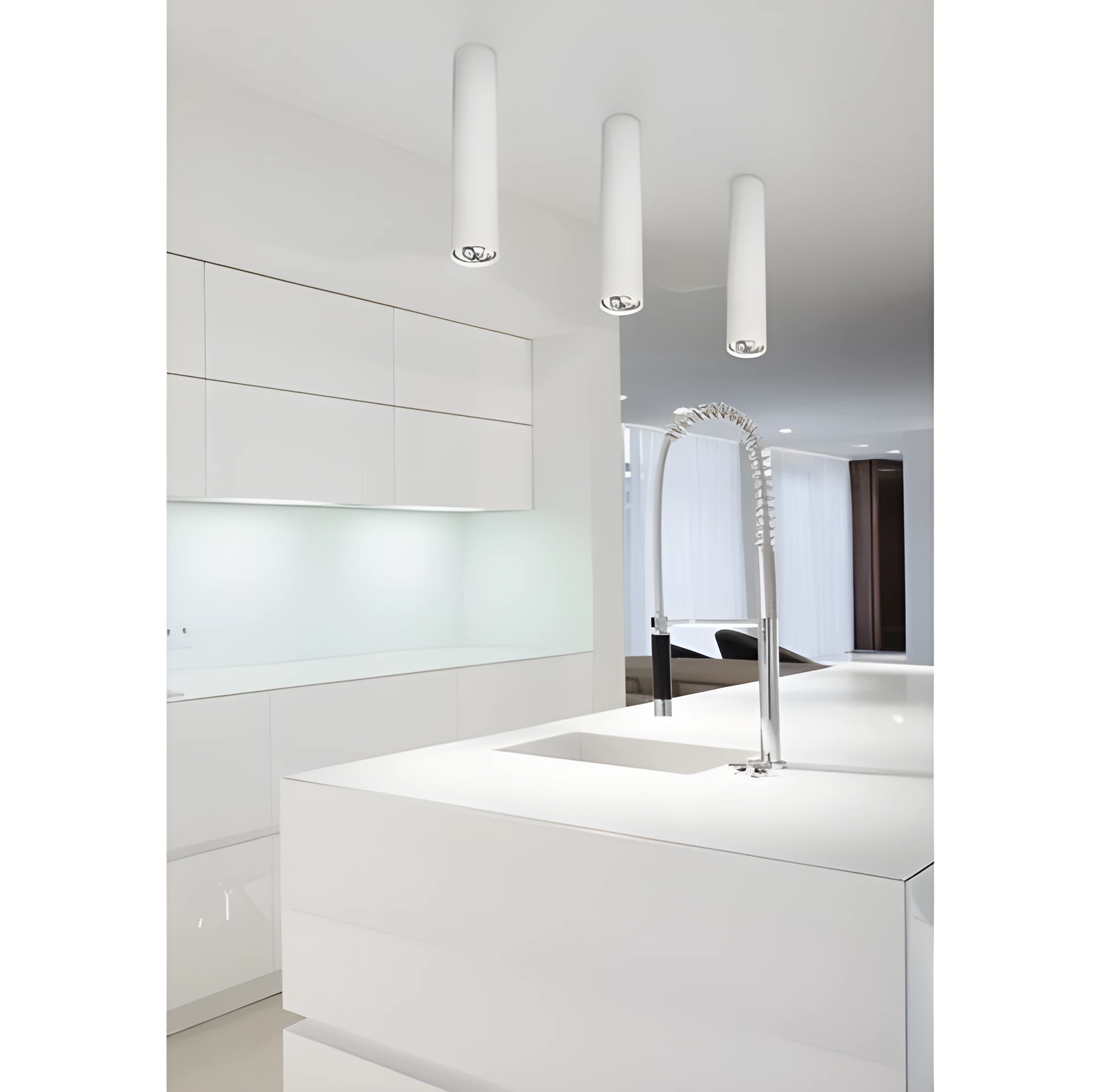 Lampa sufitowa w kolorze białym idealnie wpasuje się do kuchni nad wyspę lub innych pomieszczeń. Długa i wąska budowa lampy nowoczesnej dobrze oświetli blaty i stoły.