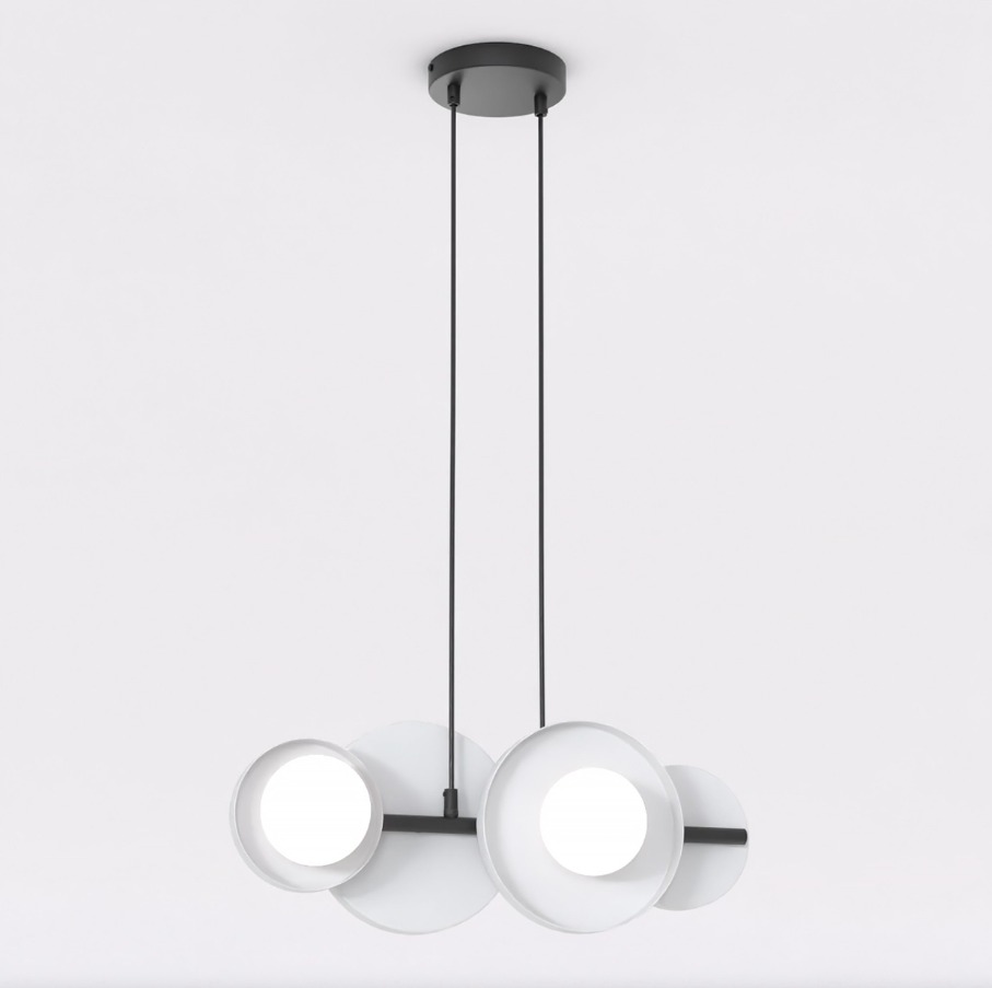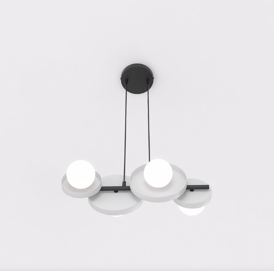 Lampa o nowoczesnej formie. Czarna metalowa belka z czterema szarymi talerzami, z których każdy kryje mleczną szklaną kulę. Doskonale sprawdzi się nad stołem w jadalni lub wyspą kuchenną, tworząc ciepłe, rozproszone światło i nadając wnętrzu eleganckiego charakteru.Zapytaj o ten produkt