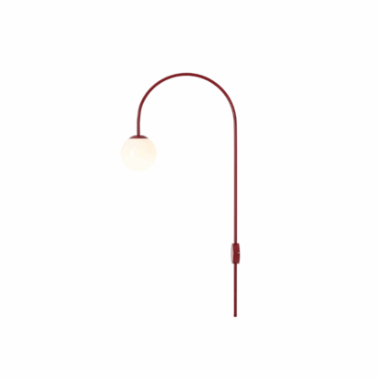 Una to kinkiet, który przykuwa wzrok swoją wyrafinowaną prostotą. Smukłe ramię w głębokim bordowym kolorze wygina się w delikatny łuk, tworząc idealną harmonię między formą a funkcją. Dotykając gładkiej powierzchni metalu, czujesz solidność wykonania - to lampa, która posłuży latami. Mleczny szklany klosz subtelnie rozprasza światło, tworząc miękką poświatę bez ostrych cieni.