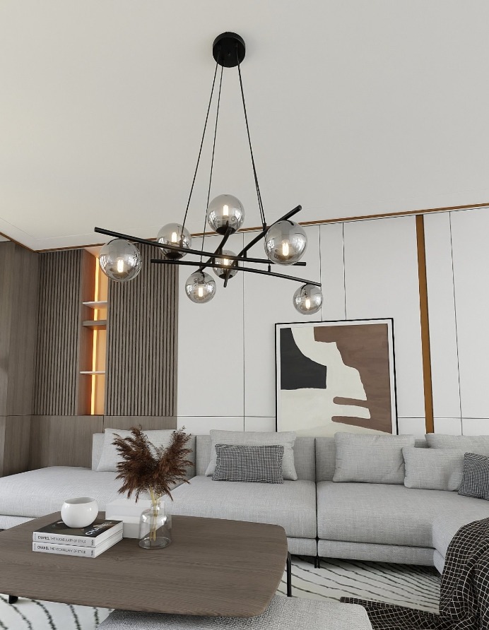 Osiem przydymionych, grafitowych kul rozłożonych na czarnych ramionach w asymetrycznym układzie, który sprawia, że lampa wygląda lekko i dynamicznie mimo sporych gabarytów. Kule mają średnicę 15 cm każda, a szkło w odcieniu smoky nie jest całkiem nieprzejrzyste, więc po zapaleniu widać delikatną poświatę żarówki i ciepłe refleksy wewnątrz klosza. To żyrandol nowoczesny, który nad dużym stołem jadalnym lub wyspą kuchenną rozłoży światło równomiernie na szerokiej powierzchni, zamiast koncentrować je w jednym punkcie. Grafitowe szkło filtruje i łagodzi strumień światła, dlatego lampa nie oślepia nawet bez dodatkowego dyfuzora, a przy żarówkach E14 o ciepłej barwie buduje kameralny, przygaszony nastrój. W otwartej strefie dziennej pełni jednocześnie rolę oświetlenia funkcjonalnego i mocnego akcentu dekoracyjnego. Zwis regulowany od 40 do 100 cm, podsufitka o średnicy 14 cm, więc zakryje standardową puszkę sufitową.
