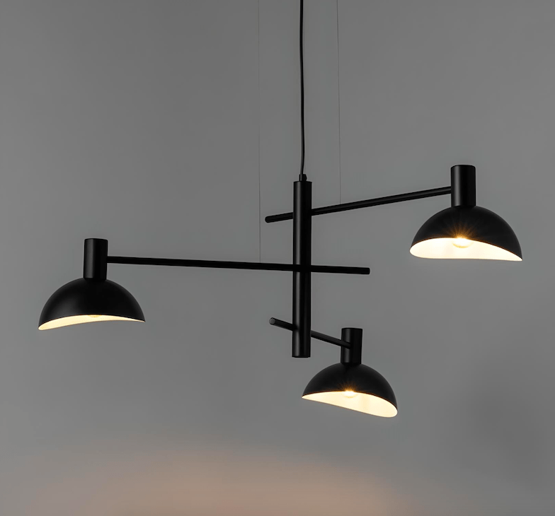 Trzy czarne metalowe półkoliste klosze rozchodzą się promieniście z jednego punktu, tworząc lekką, otwartą kompozycję o rozpiętości 75 cm. Ramiona wychodzą z centralnego trzpienia na różnych wysokościach i w różnych kierunkach. Czarna lakierowana stal ma matowe, satynowe wykończenie bez połysku, co nadaje całości lekko industrialny, a zarazem elegancki charakter. Asymetryczny układ ramion sprawia, że żyrandol nowoczesny Skylim 3 najlepiej prezentuje się nad stołem w jadalni, w centrum niewielkiego salonu albo w sypialni.Zapytaj o ten produkt