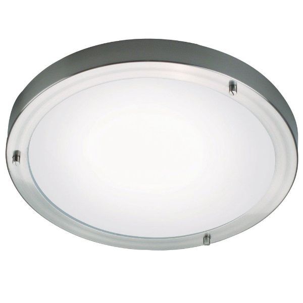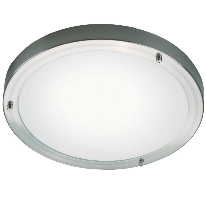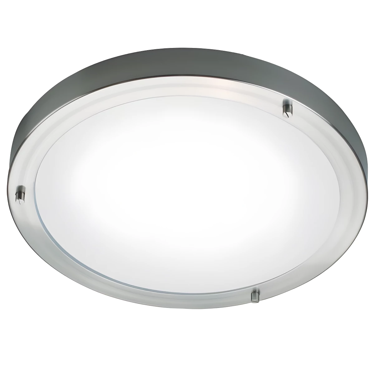 Lampa sufitowa Ancona Maxi wykonana jest z metalu i szkła w wykończeniu szczotkowanej stali. Mleczny klosz rozprasza światło i ogranicza olśnienie, zapewniając równomierne oświetlenie w strefach użytkowych. Kluczowe wymiary (wys. 8 cm × Ø 31,5 cm) ułatwiają dobór miejsca montażu w niższych pomieszczeniach. gwint E27 (maks. 40 W na punkt) oraz IP44 — do łazienek i innych pomieszczeń wilgotnych. Nie. Plafon jest sprzedawany bez źródeł światła. Zastosuj dwie żarówki na gwint E27 o mocy do 40 W każda (rekomendowane LED), dobierając barwę i strumień do funkcji pomieszczenia. Tak. Klasa szczelności IP44 oznacza ochronę przed bryzgami wody, dzięki czemu oprawa sprawdzi się w łazience (z zachowaniem zasad stref). Może być również stosowana w korytarzu, kuchni i sypialni. Sama oprawa nie posiada elektroniki ściemniającej. Ściemnianie jest możliwe po użyciu ściemnialnych żarówek E27 oraz kompatybilnego ściemniacza ściennego.Dlaczego warto wybrać plafon Ancona Maxi do łazienki?