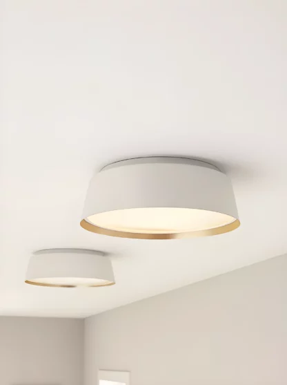 Nowoczesny plafon sufitowy Asher ma biały metalowy klosz z subtelnym złotym wykończeniem, które dodaje całości elegancji. Mleczna osłona od spodu zmiękcza światło żarówek. Sprawdzi się więc w salonie, sypialni lub na korytarzu. Jest idealnym wyborem do niższych wnętrz.
