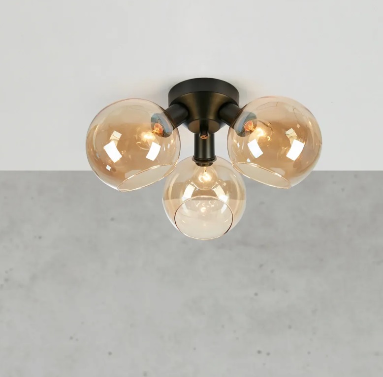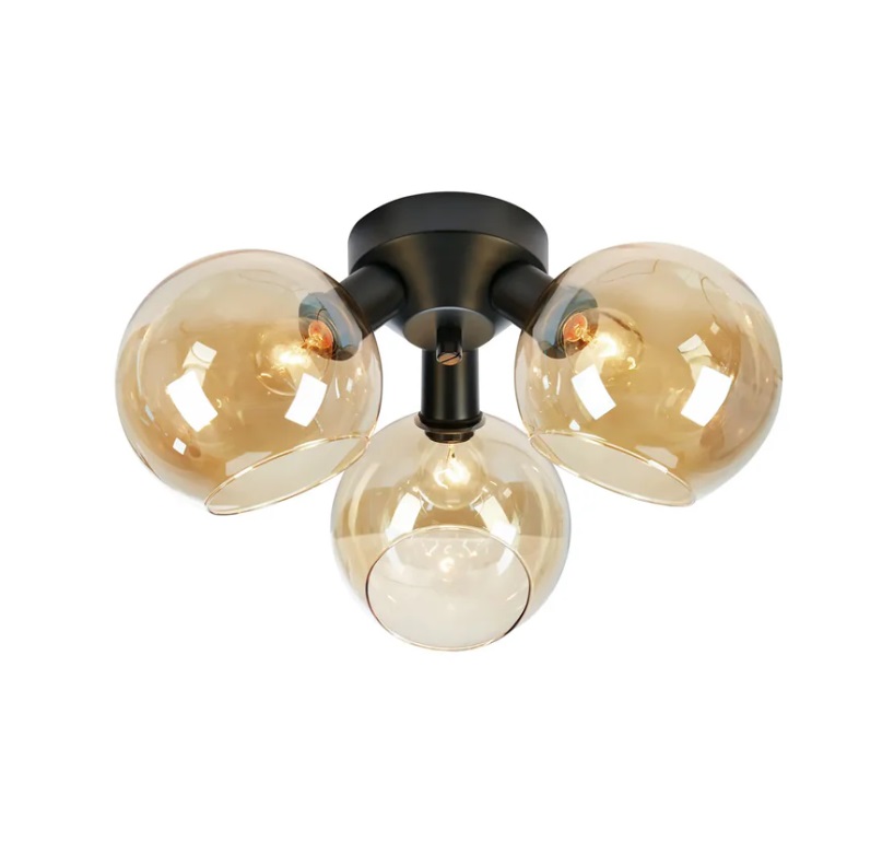 Plafon sufitowy Artis 3 prezentuje trzy bursztynowe szklane kule osadzone na czarnej podstawie, tworząc dekoracyjną kompozycję przy suficie. Wymiary 20 / 40 / 40 cm (wys./szer./dł.) oraz trzy punkty świetlne 3 × E14 (maks. 10 W) sprawiają, że lampa dobrze sprawdza się jako główne oświetlenie.