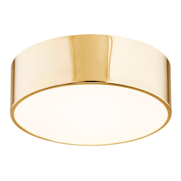 Plafon Atlantis z kolekcji o tej samej nazwie to kompaktowa lampa sufitowa o cylindrycznej formie, wykończona w połyskliwym złotym kolorze. Obudowa z metalu w odcieniu mosiądzu odbija światło otoczenia, a od spodu zamknięta jest mlecznym szklanym dyfuzorem, który równomiernie rozprowadza światło w dół. Przy średnicy 35 cm sprawdzi się jako oświetlenie w salonie, kuchni lub sypialni, szczególnie w aranżacjach utrzymanych w ciepłej, beżowej tonacji.