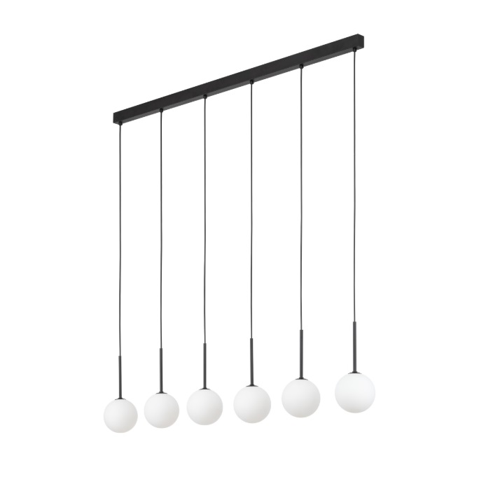 Podłużna wisząca lampa Martin 6 z opalowymi kloszami idealna nad wyspę kuchenną