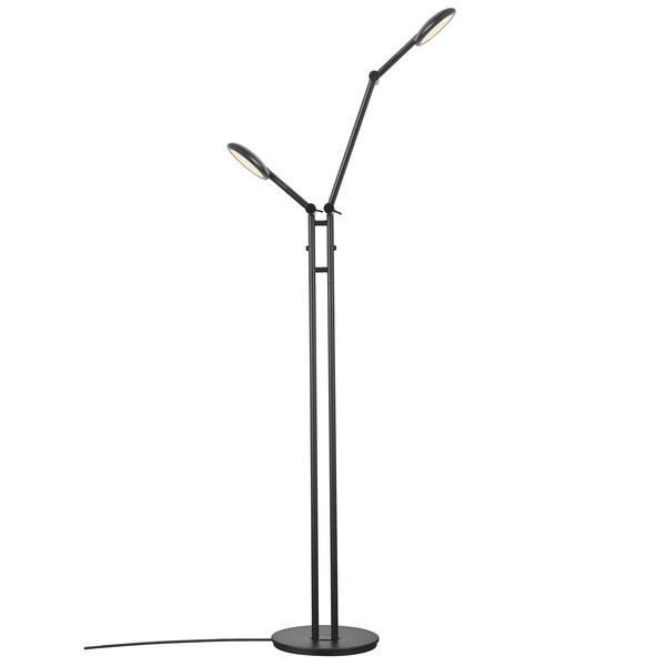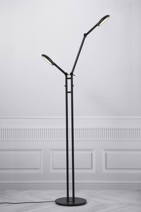 Czarna lampa podłogowa z dwoma regulowanymi kloszami, dotykowy ściemniacz