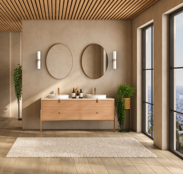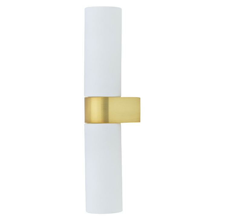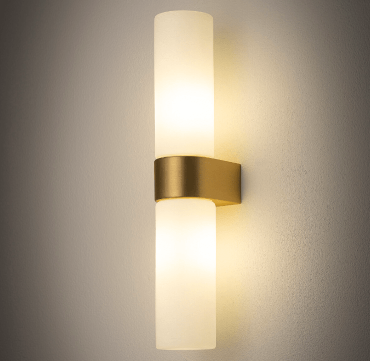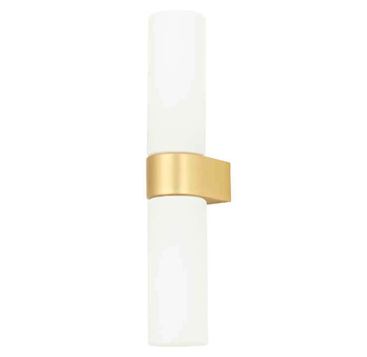 Podwójny kinkiet łazienkowy Natalie II w odcieniu mosiądzu, idealny do oświetlenia lustra