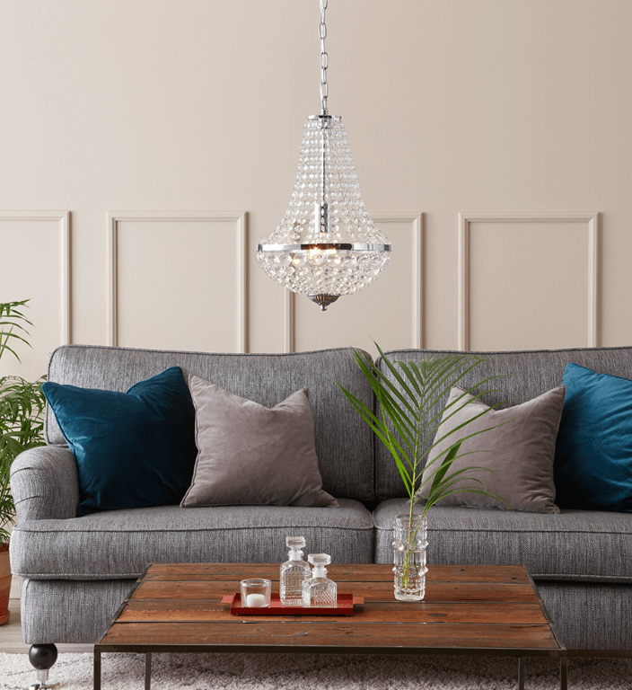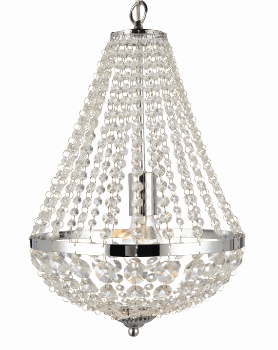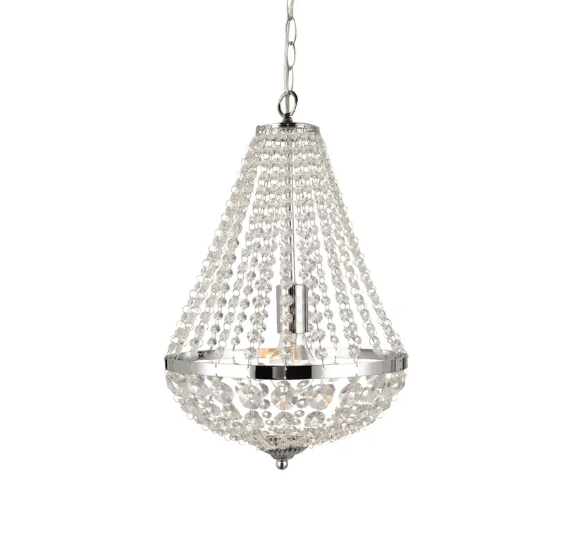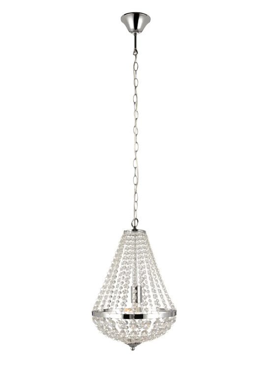 Srebrna wisząca lampa glamour Island o średnicy 30 cm z kryształowymi łańcuszkami