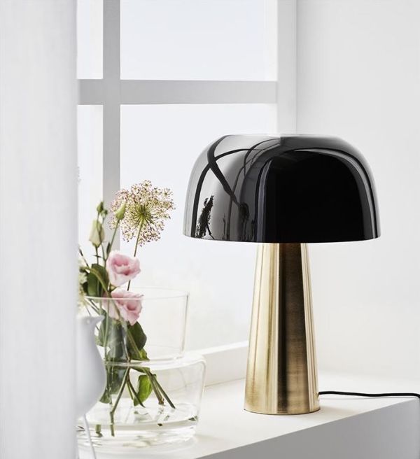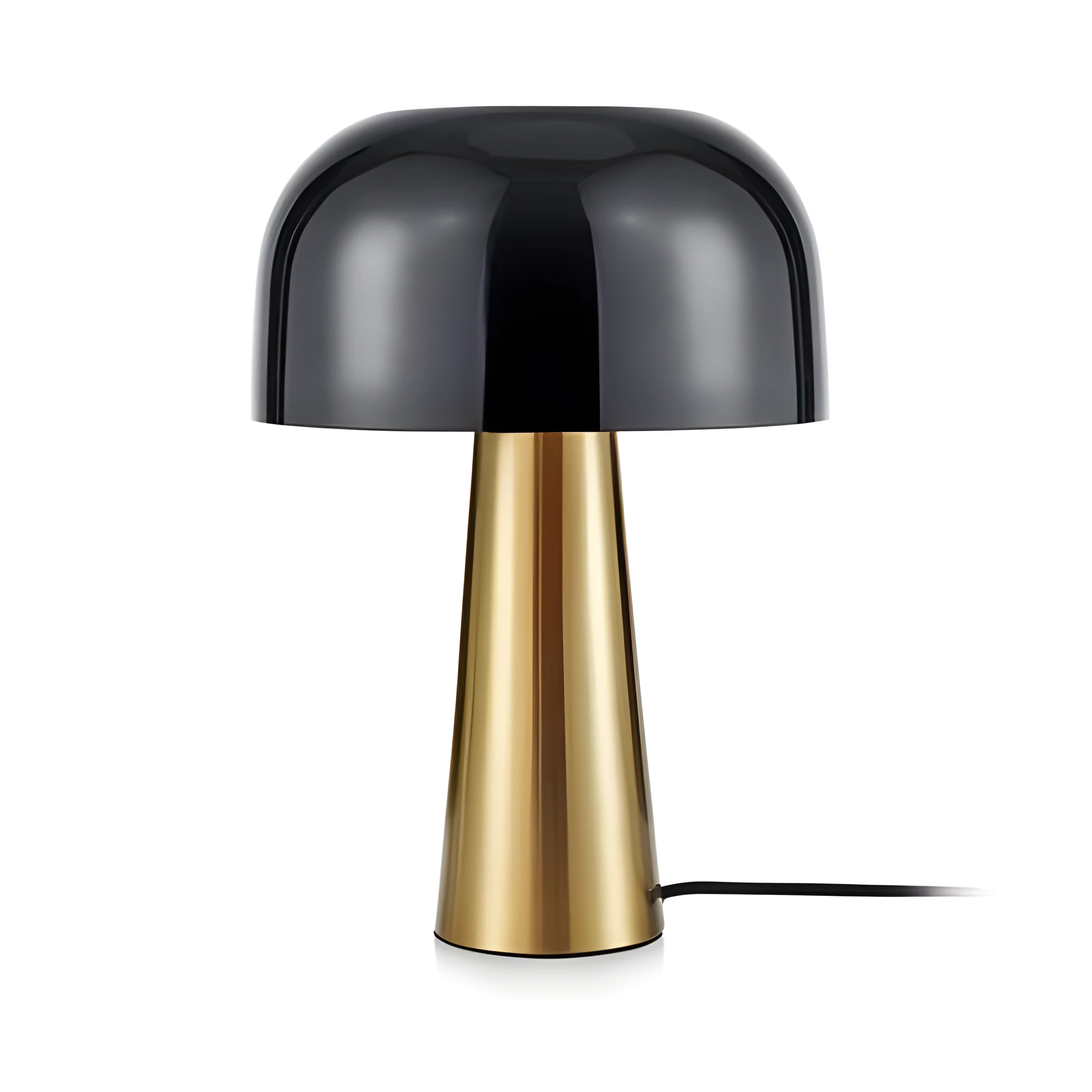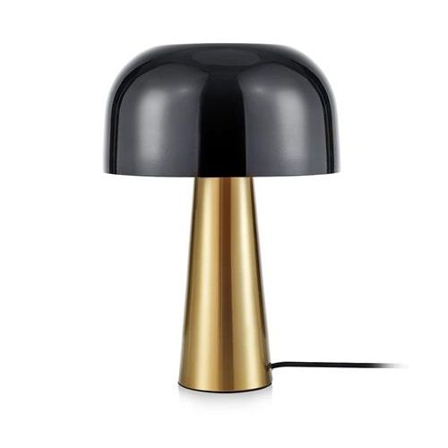 Stołowa lampa Blanca z półokrągłym czarnym kloszem i złotą podstawą