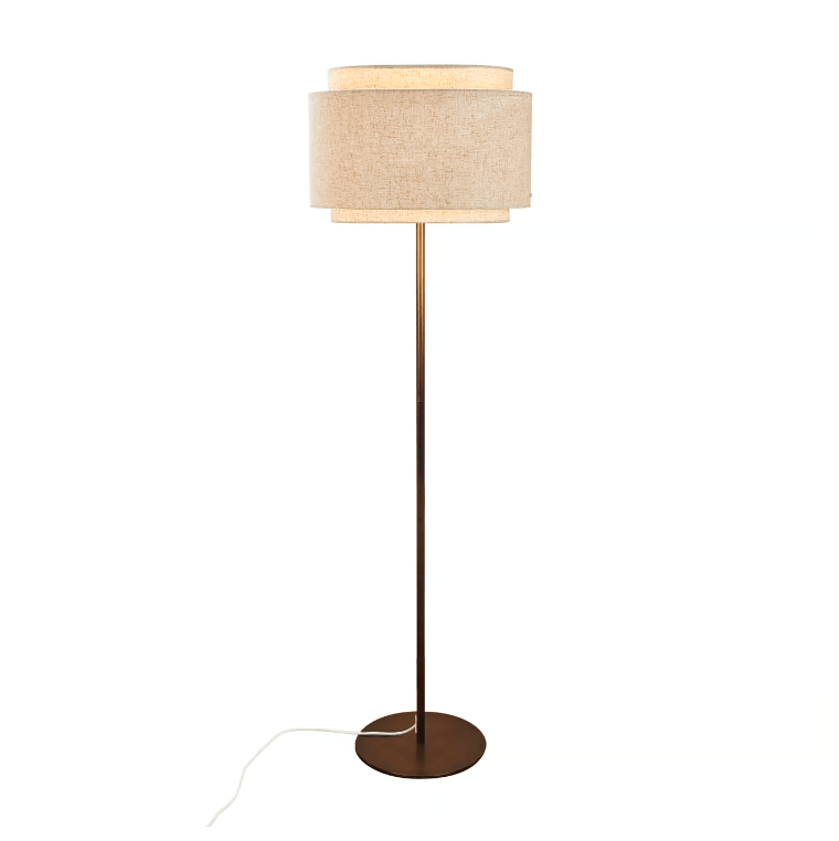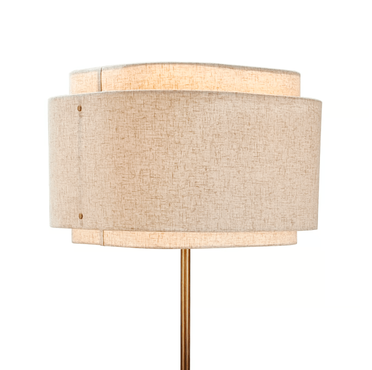 Stylowa lampa stojąca Takai z lnianym kloszem i mosiężną podstawą