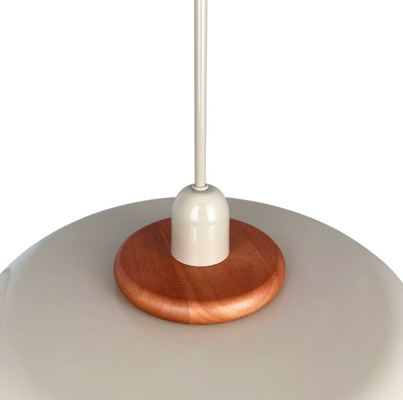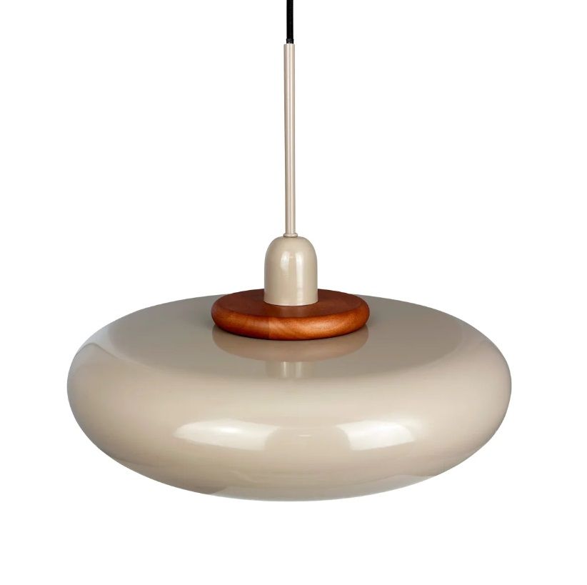 Biała wisząca lampa Planet z płaskim kloszem i drewnianym akcentem