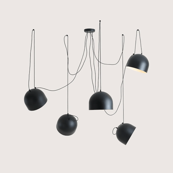 Stylowy wiszący żyrandol Noor 5 z dużymi czarnymi kloszami