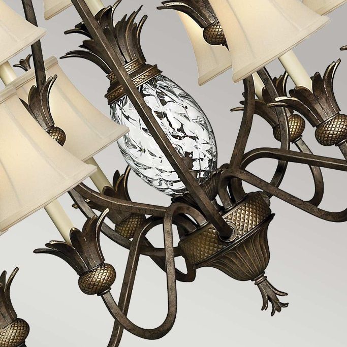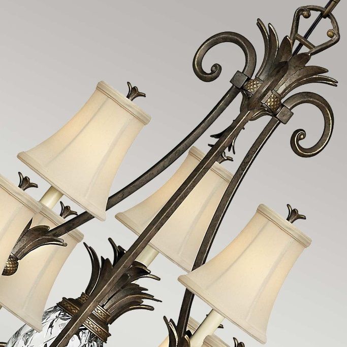 Stylowy żyrandol w rustykalnym stylu Plantation w brązowym kolorze z dziesięcioma kremowymi abażurami