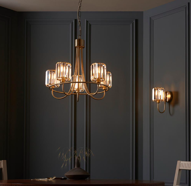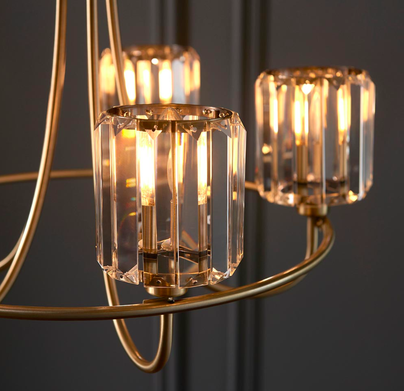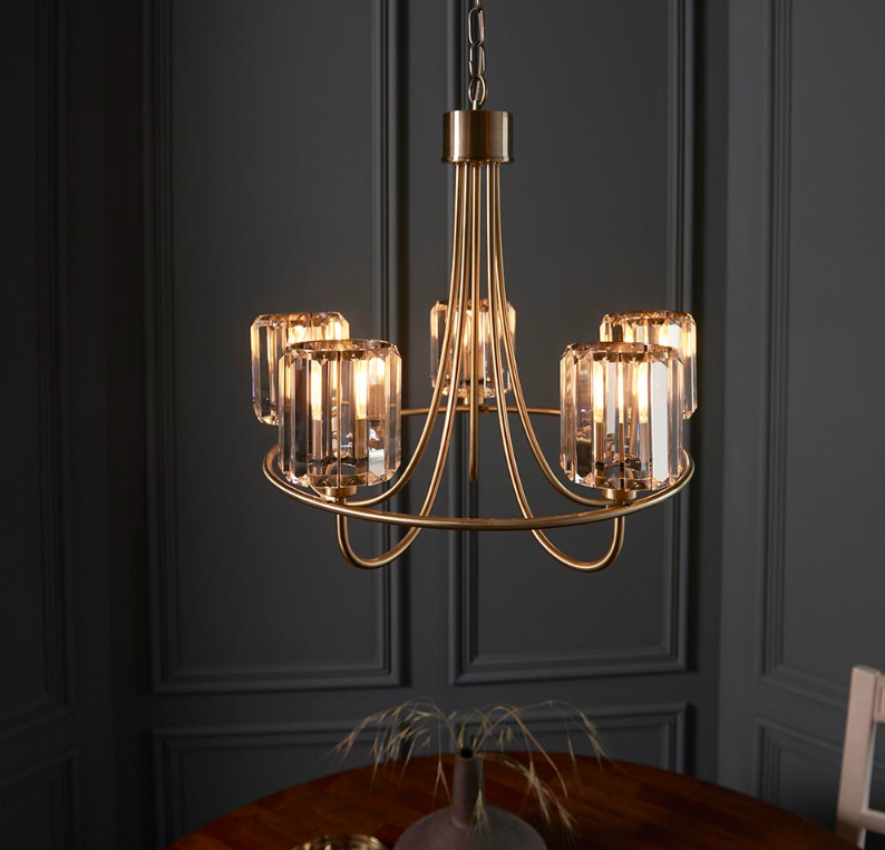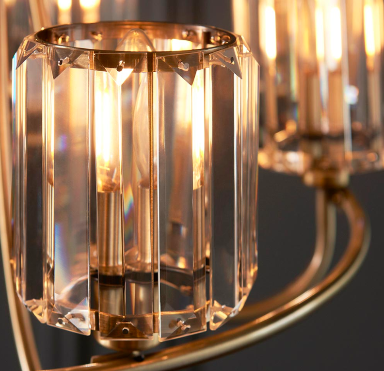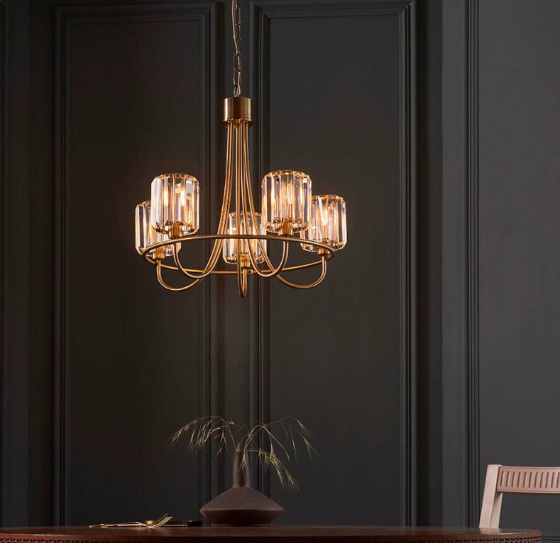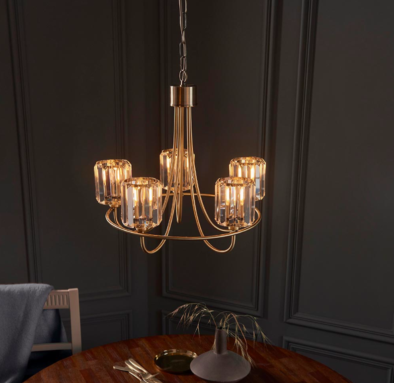 Żyrandol Berenice 5 wykonany jest z metalu i szkła w wykończeniu antyczny mosiądz. Przezroczyste, fasetowane klosze ze szkła rozpraszają światło żarówek i tworzą efekt dekoracyjnych refleksów w całym pomieszczeniu. Kluczowe wymiary (wys. 62–200 cm × Ø 51 cm) ułatwiają ustawienie wysokości nad stołem lub w centrum salonu. E14 (maks. 5 × 6 W) oraz IP20 — do wnętrz suchych. Pasuje do stylów: art déco, klasyczny, glamour. Rekomendowane pomieszczenia: salon, jadalnia, sypialnia. Montaż: na suficie, nad stołem lub w centralnej części pomieszczenia. Nie, żyrandol Berenice 5 nie ma żarówek w komplecie. Oprawa wymaga pięciu źródeł światła z gwintem E14 o maksymalnej mocy 6 W każde. Dzięki temu samodzielnie wybierzesz żarówki o preferowanej jasności i barwie światła, dopasowane do wielkości pomieszczenia oraz charakteru aranżacji. Tak, wysokość żyrandola Berenice 5 jest regulowana w zakresie od 62 do 200 cm. Pozwala to zamontować go zarówno w wyższych, jak i niższych pomieszczeniach. Możesz ustawić oprawę niżej nad stołem w jadalni lub wyżej, gdy ma pełnić rolę głównego oświetlenia salonu. Tak, żyrandol Berenice 5 jest przystosowany do ściemniania. Wymaga zastosowania ściemnialnych żarówek E14 oraz kompatybilnego ściemniacza ściennego. Dzięki temu łatwo zmienisz intensywność oświetlenia od jasnego, funkcjonalnego światła do nastrojowego półmroku podczas wieczornego odpoczynku lub spotkań.Dlaczego warto wybrać żyrandol Berenice 5?