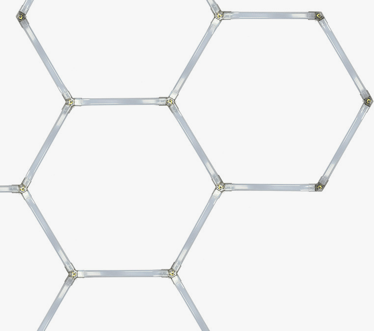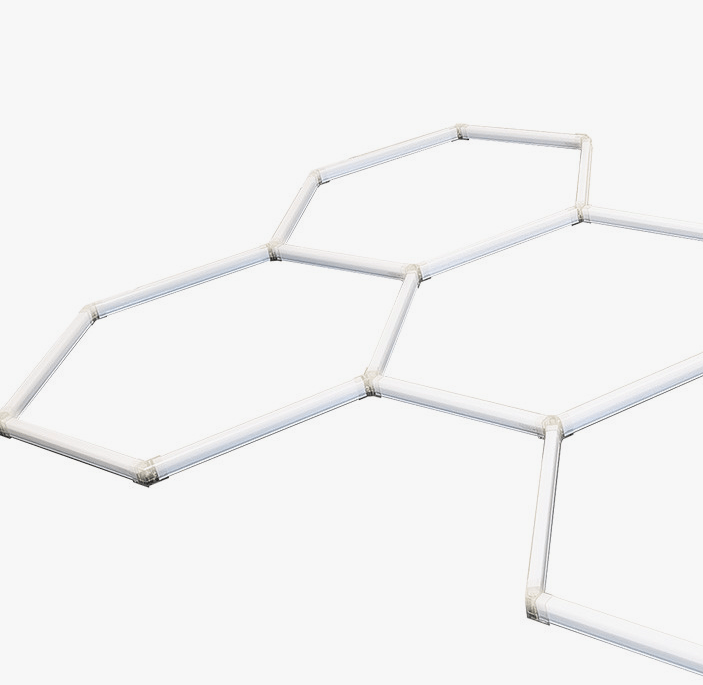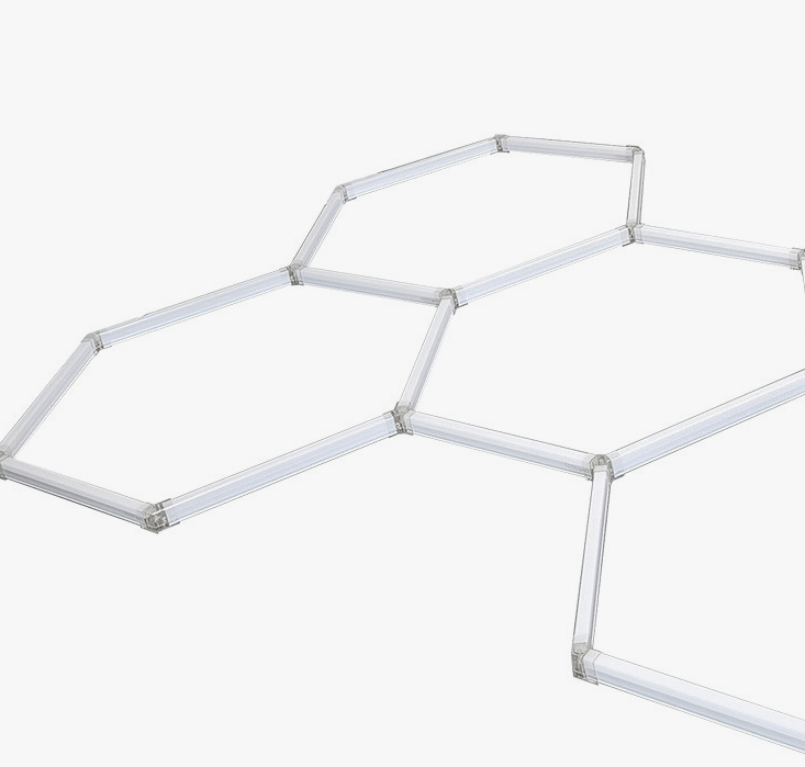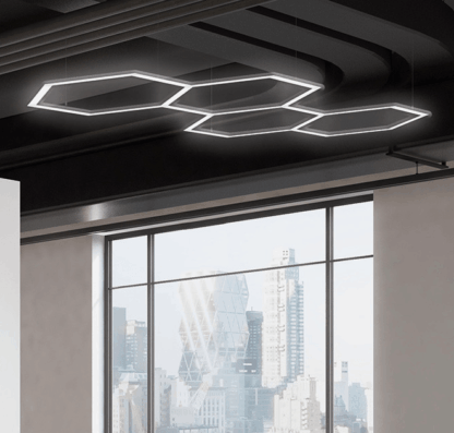 System oświetlenia biurowego Geometric LED w formie sześciokątów zawieszonych na linkach