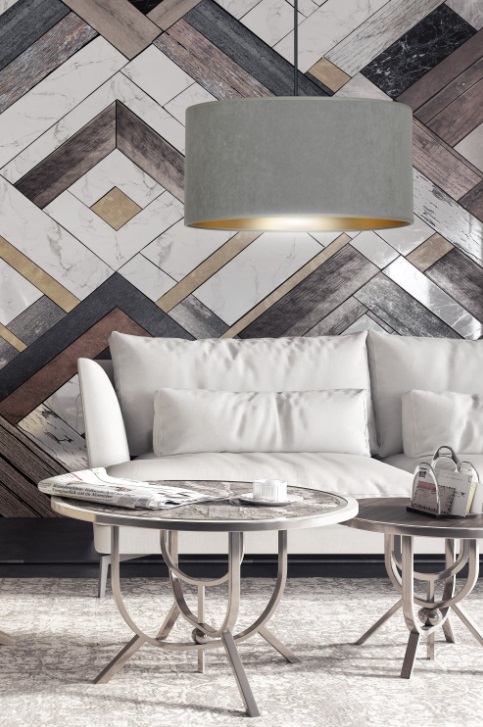 Szara lampa wisząca Hilde z welurowym abażurem i złotym wnętrzem