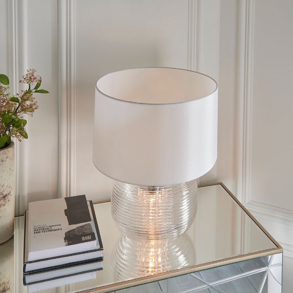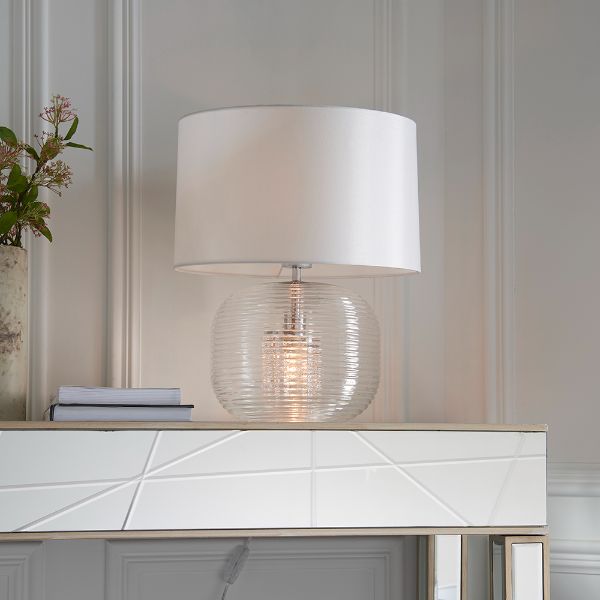 Szklana lampa stołowa Westcombe z białym abażurem