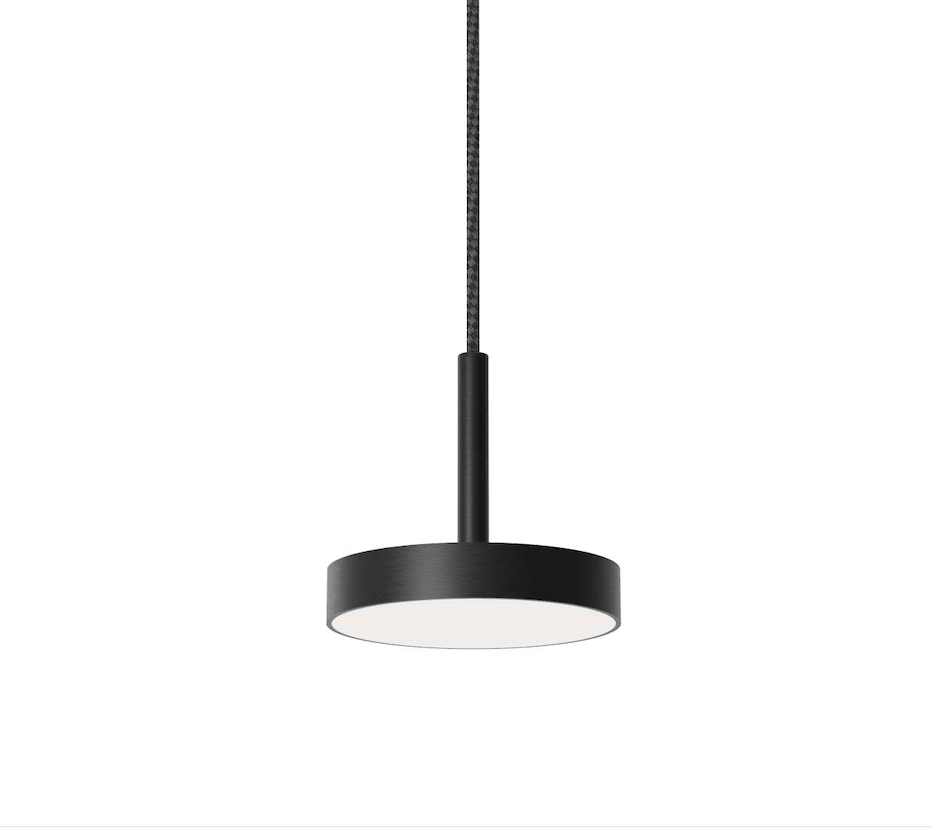 Kompaktowa lampa wisząca o średnicy zaledwie 14 cm, z płaskim aluminiowym kloszem w matowej czerni i akrylowym dyfuzorem od spodu, który równomiernie rozprowadza światło w dół. Smukły metalowy trzon przechodzi w przewód z tekstylnym oplocie w ciemnym kolorze, co nadaje całości spójny, minimalistyczny charakter. Niewielki rozmiar sprawia, że Rafaela Mono sprawdzi się jako punktowe oświetlenie nad blatem, konsolą lub szafką nocną, a także w zestawieniu kilku sztuk w jednym rzędzie.