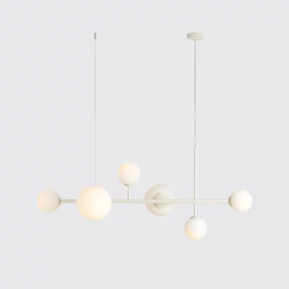 Duży biały żyrandol Dione 9 z kulistymi kloszami na wydłużonym stelażu