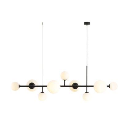 Duży biały żyrandol Dione 9 z kulistymi kloszami na wydłużonym stelażu