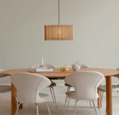Wisząca lampa drewniana Komorebi z lameli UMAGE w kolorze jasnego dębu, o średnicy 51 cm