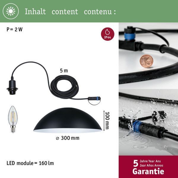 Wisząca lampa Mapalo Plug&Shine o klasie ochrony IP44, idealna na taras