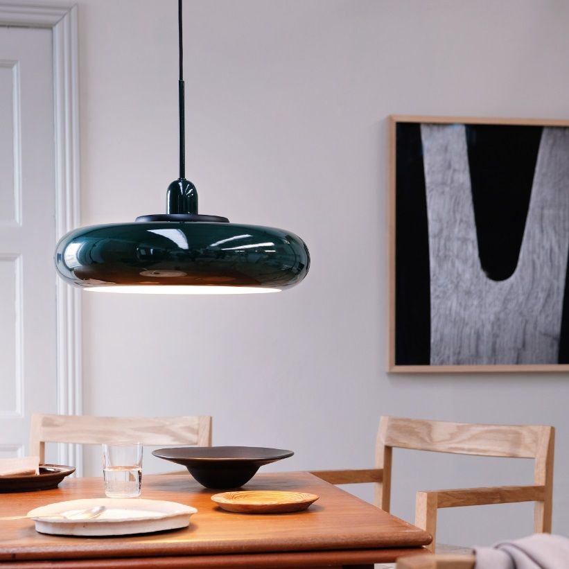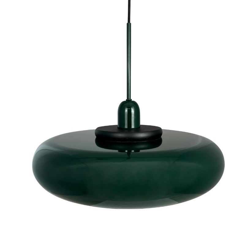 Wisząca lampa Planet w ciemnozielonym kolorze z płaskim kloszem nad stół
