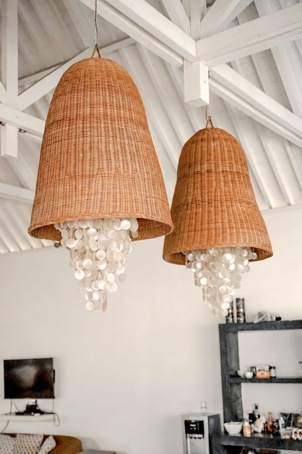 Wisząca lampa Shell z dużym rattanowym kloszem i ozdobami z muszelek