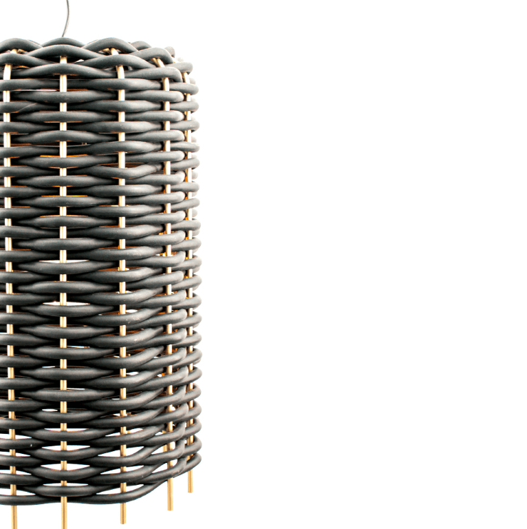 Wisząca lampa Suami A z plecioną gumową konstrukcją i wysokim czarnym kloszem o wysokości 62 cm