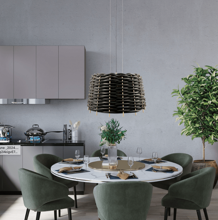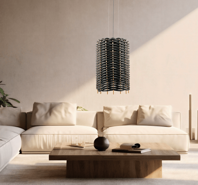 Napisz pierwszą opinię o „Wisząca lampa Suami A z plecioną gumową konstrukcją i wysokim czarnym kloszem o wysokości 62 cm”