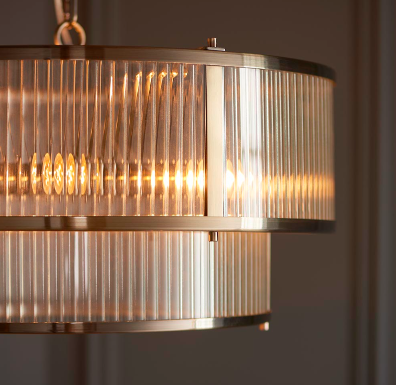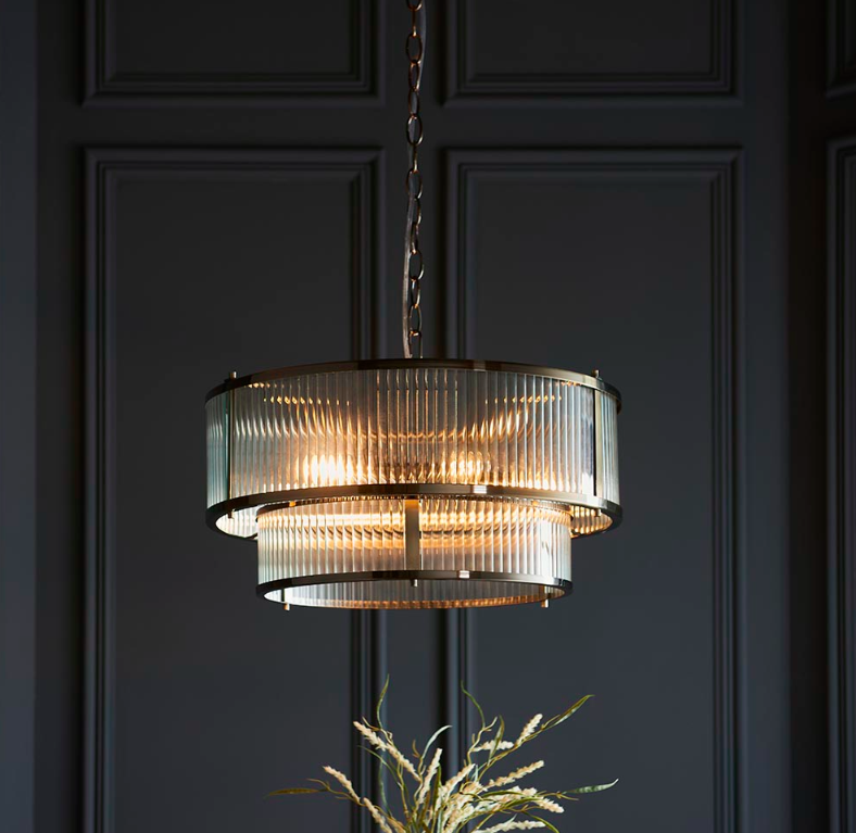 Wiszący żyrandol Art Deco Ridgeton 50 z żebrowanym szklanym kloszem