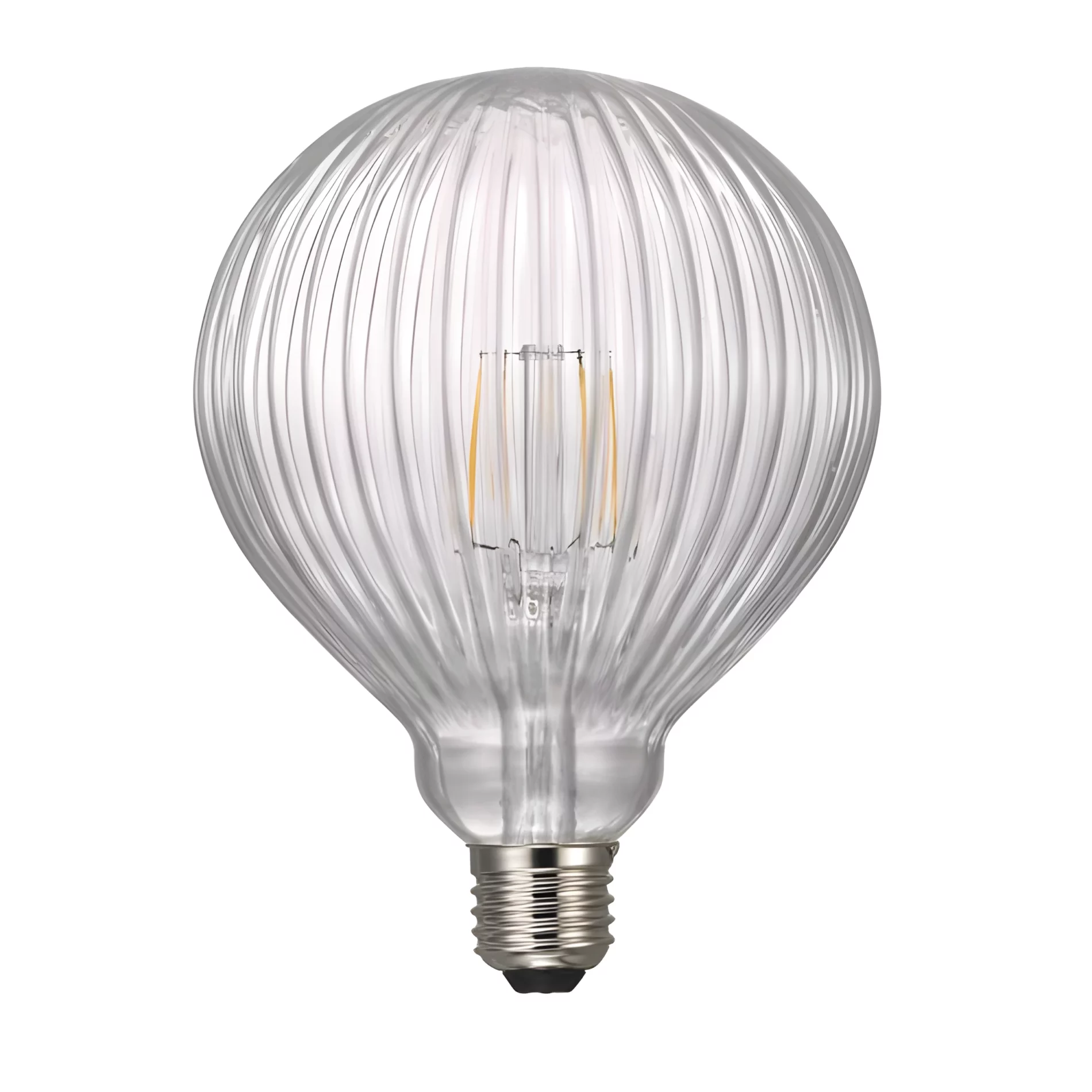 • Szkło prążkowane i dekoracyjny kształt G125 — żarówka wyróżnia się w oprawach bez klosza, podkreślając charakter wnętrza ciepłym, nastrojowym światłem.