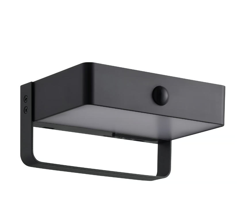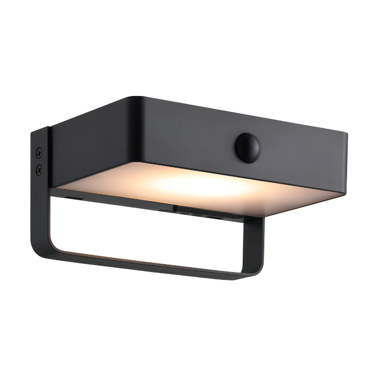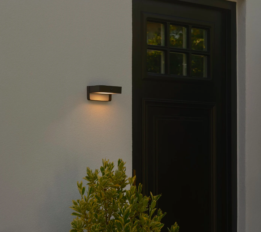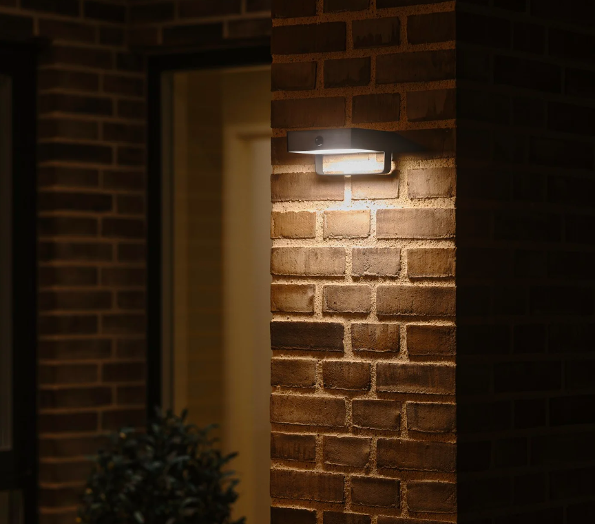 Zewnętrzny kinkiet Saulio z czujnikiem ruchu i klasą szczelności IP44, idealny przy drzwiach wejściowych