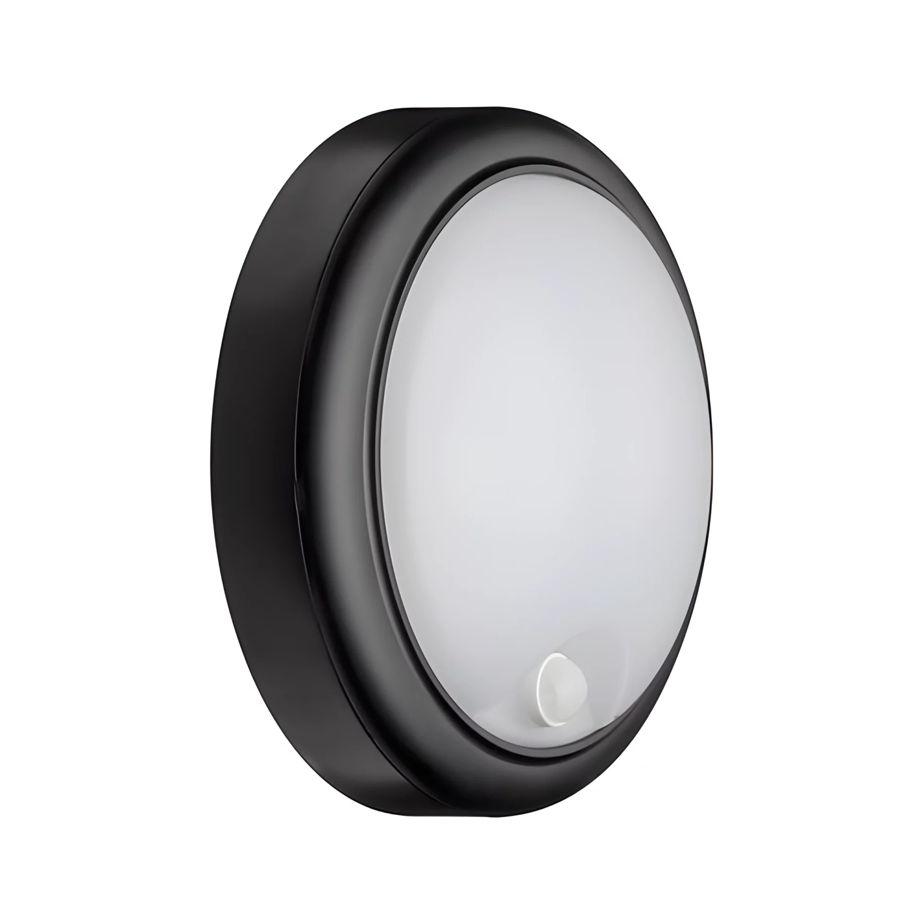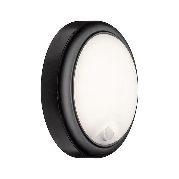 Okrągły kinkiet z mlecznym kloszem w antracytowej oprawie. Posiada wbudowany czujnik ruchu. Dobrze doświetli korytarz, klatkę schodową lub przedpokój.
