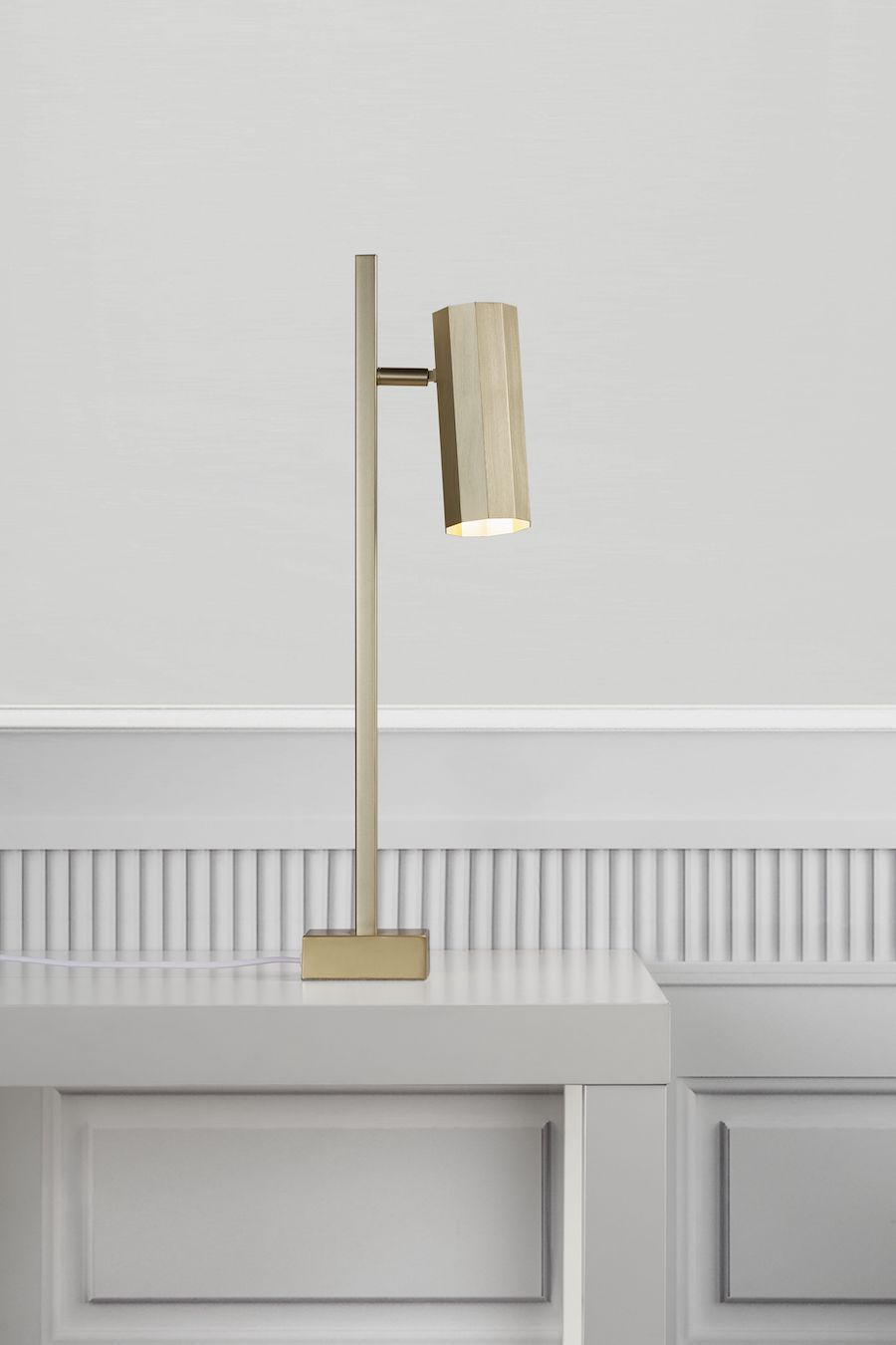 Efektowna lampa stołowa z regulowanym kloszem, w kolorze satynowego mosiądzu. Niewielki włącznik został usytuowany w górnej części klosza, dzięki czemu przewód lampy można dyskretnie zamaskować. Lampa idealnie sprawdzi się w eleganckim gabinecie, sypialni, czy salonie ze złotymi dodatkami.