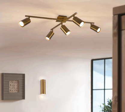 Złota sufitowa lampa Marley 5 z regulowanymi reflektorami do salonu