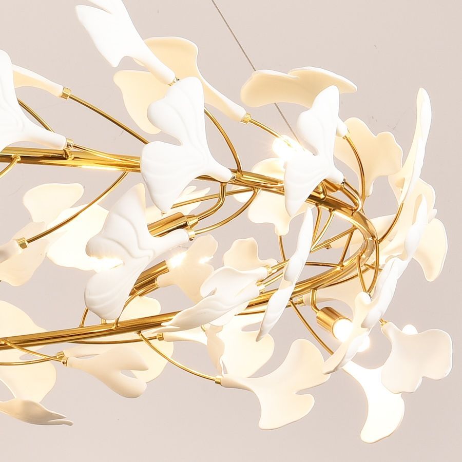 Złota wisząca lampa Botanika 80 z białymi ceramicznymi listkami