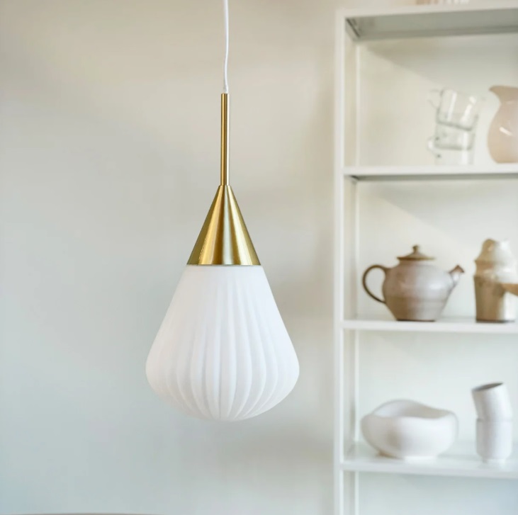 Pierwszą rzeczą, która zwraca uwagę w lampie Ballon 21, jest jej wyjątkowa faktura klosza. Delikatne żłobienia w mlecznobiałym szkle tworzą subtelną grę światła i cienia, nadając całości organiczny, niemal rzeźbiarski charakter. Złote mocowanie kontrastuje z jasnością szkła, wprowadzając ciepły akcent, który pięknie współgra z drewnianymi meblami czy miedzianymi dodatkami.