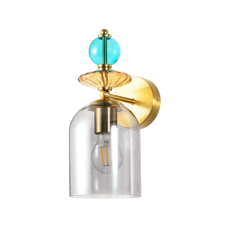 Klosz z przezroczystego dymionego szkła w kształcie kopuły skierowanej w dół odsłania żarówkę na trzonku E27, więc snop światła pada głównie ku podłodze, a przez transparentne ścianki delikatnie rozchodzi się na boki. Żarówka jest widoczna, dlatego warto postawić na dekoracyjny filament, który doda ciepła i podkreśli charakter oprawy. Kinkiet ścienny tego typu sprawdzi się jako nastrojowe doświetlenie przy łóżku w sypialni, na ścianie w salonie obok fotela lub w korytarzu, gdzie kolorowe szklane elementy ożywią neutralną ścianę. Klasa szczelności IP20 oznacza, że lampa przeznaczona jest wyłącznie do suchych pomieszczeń.