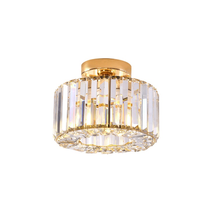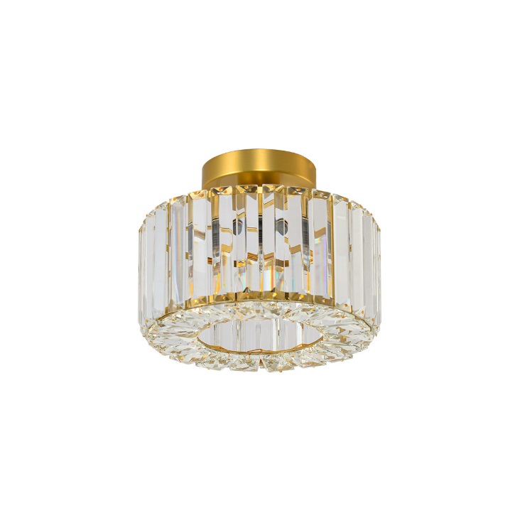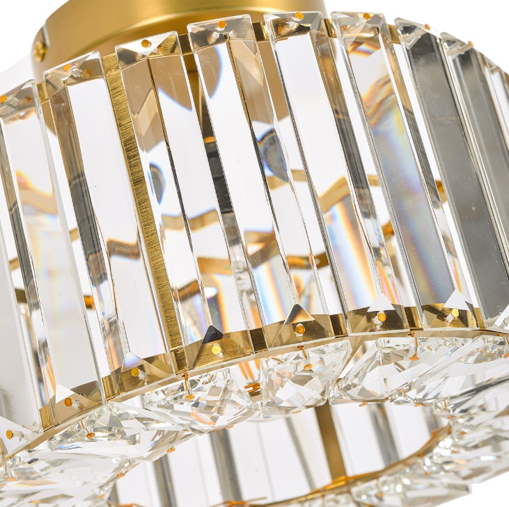 Pierwszym, co przyciąga uwagę w plafonie Vetro 25, jest hipnotyzująca kompozycja szklanych pryzmatów układających się w cylindryczny klosz. Dotykając delikatnych krawędzi kryształków, czujesz ich chłodną gładkość i precyzję wykonania - każdy element został perfekcyjnie dopasowany, tworząc spójną, luksusową całość. Złota podstawa o satynowym wykończeniu emanuje ciepłem i elegancją, kontrastując pięknie z transparentnością szkła.